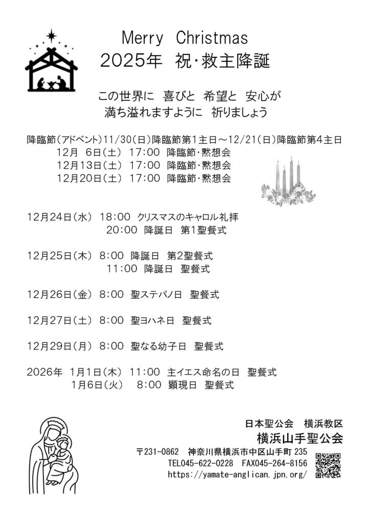 2025年11月21日 / 最終更新日時 : 2025年11月21日 横浜山手聖公会Web担当 クリスマス 2025年アドベント~クリスマス案内 2025年のアドベント(降臨節)とクリスマスの礼拝のスケジュールは以下の通りです。 どうぞいらしてください。 BlueskyCopy